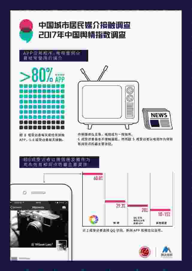 在表达个人信息和观点方面,超6成被调查者选择朋友圈作为最主要的渠道。近 3 成受访者则选择微博,近 2 成受访者选择 QQ 空间、新闻 App 和微信公众号。