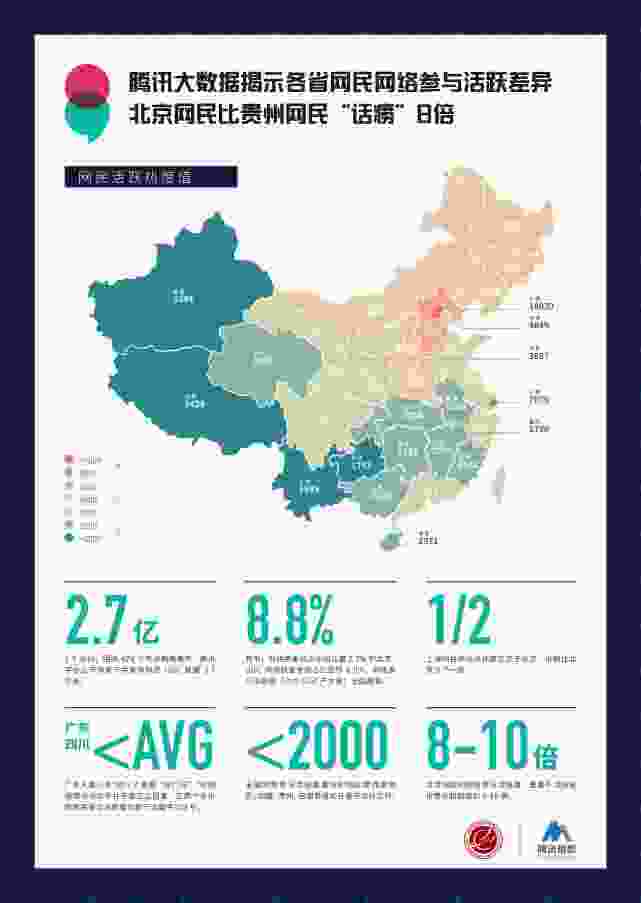 中国社会舆情指数 2017 年上半年网民参与活跃度排行显示,今年 1-5 月份,围绕热点舆情事件,网民在腾讯平台公开场景下共生产了 UGC(用户自生成内容)数量超过 2 亿条,并且各省(市、区)网民数量存在较大差异。
