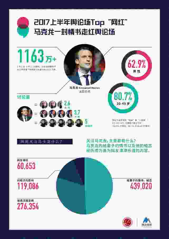 中国社会舆情指数 2017 年上半年舆情热点排行显示,5 月份新当选为法国总统的马克龙,成为 2017 年上半年中国网络舆论场中的“网红”。5 月 1 日至17 日,马克龙在腾讯平台公开场景下的网民讨论量超过 1100 万条。