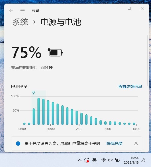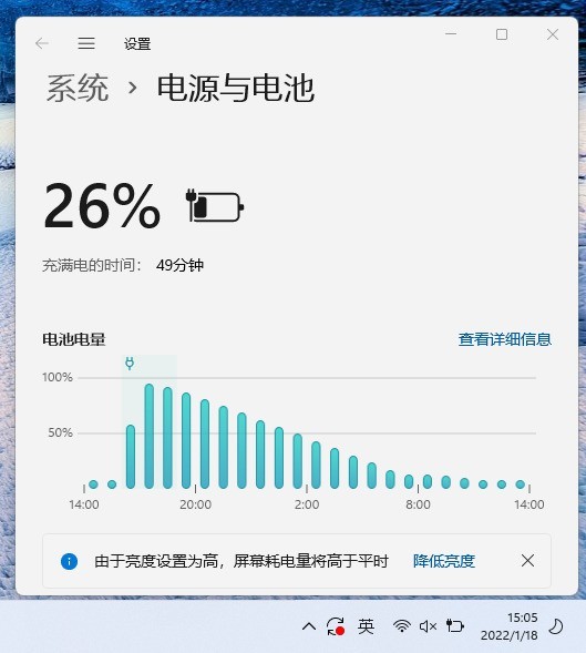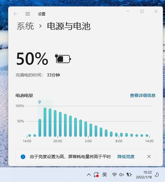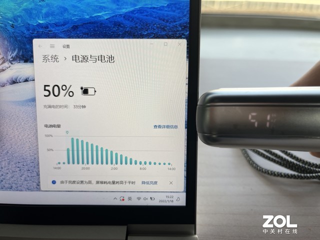 充电至50%时,时间为15:22分,此时通过充电宝中的LED显示屏可知,电量还剩下51%,有意思的是,笔记本电量上升的幅度与充电宝内电量下降的幅度一致。