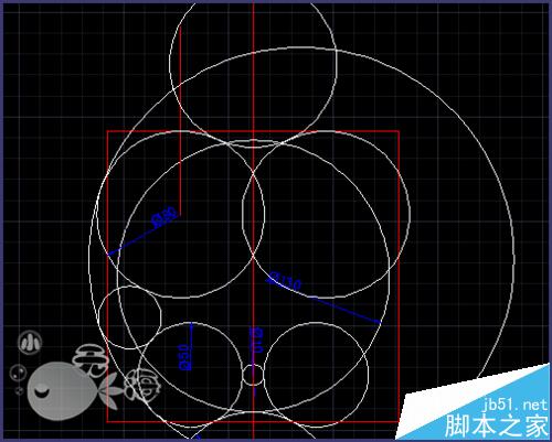 1、先画三个圆,圆心在同一条直线上,如图所示直径分别是50,10,50。PS:红色的为辅助线