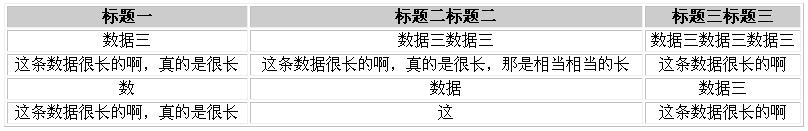 这种对齐方式是Table完全默认的,<th />标签内容居中对齐,<td />标签内容左对齐,似乎也完全合情合理,可是如下图中所示,当其中一条数据很长但其它数据都很短时,这样子的易识别性依然不高。当其中某一条数据很长时,表格标题将离数据短的那个内容很远,同样也是增加了阅读的负担与时间;