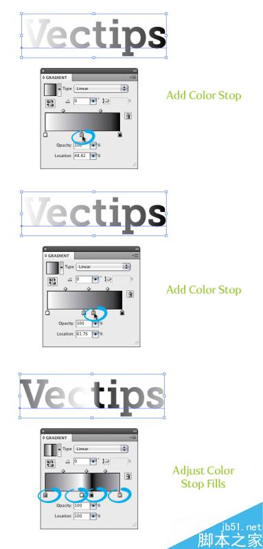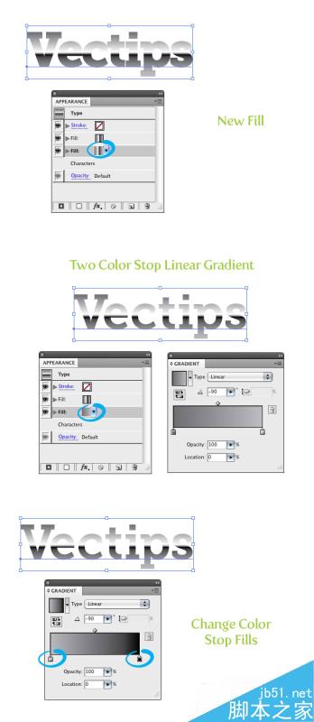 5:从外观面板弹出菜单,选择新的填充。 选择在小组第二的外观,改变填充线性渐变色。改变第一个色块为32%黑色,第二哥色块为100%黑色。 确保倾斜角度设置为-90%。