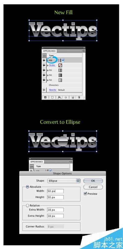 9:其实做到这里,我们要制作的金属文字效果就完成了,但是我们还可以添加一些星光之类的东西。让整个效果更丰富。首先创建一个新的填充图层,同时确保该层在最上面。 执行:效果>“转换为形状>椭圆。 在形状选项对话框中,检查绝对径向按钮,改变宽度和高度为50像素。
