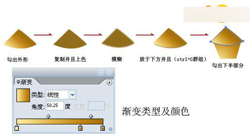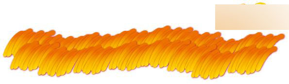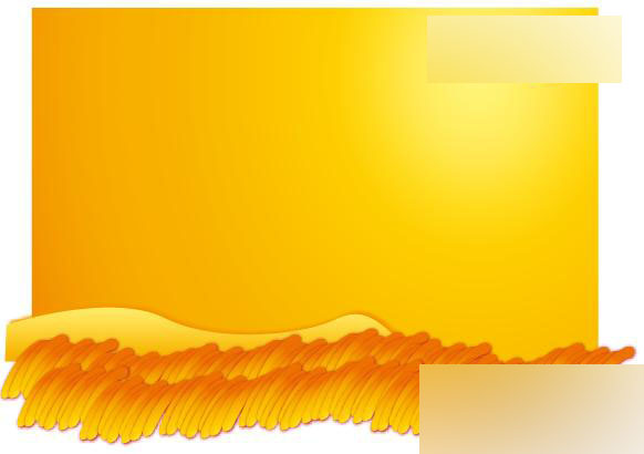 首先,我们先用钢笔工具勾出自己心中麦子的样子``因为我是想表现一幅可爱``活泼的金秋的感觉``所以我的麦子画的是弯弯的圆柱体~!并且使用了主题所需要的渐变填充•“黄-橘黄”然后复制了一层放在它的下面并且填充了褐色(参考值C=25 M=25 Y=100 K=0)同样也使用了模糊。