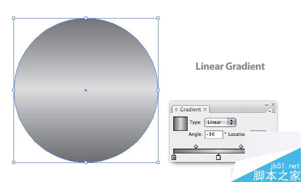 With the ellipse selected, create a Linear Gradient from the Gradient Panel. Add another swatch to the Gradient Slider by clicking just below the slider. Change the first swatch to a 57% black, the second swatch to a 12% black, and the third swatch to a 57% black.
