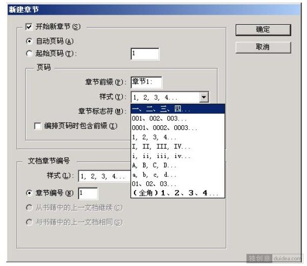 使用“页码和章节选项”命令可以指定页码的样式,如罗马数字、阿拉伯数字、汉字等。该“样式”选项允许你选择页码中的数字位数,例如 001 或 0001。