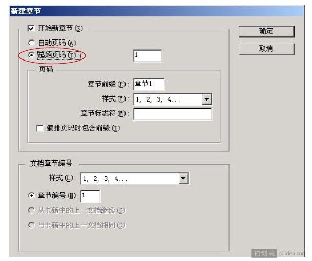 ②在打开的“新建章节”对话中点选“起始页码”,按确定。