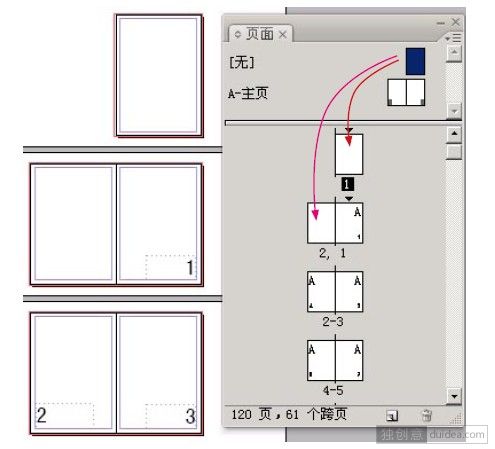 ④在页面调板上将“无”主页拉到原来的第1 页和第2 页上,页码消失。