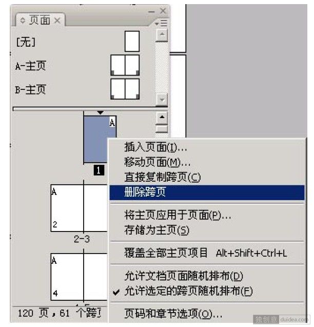 ②在页面调板上选择第1 页,点右键菜单“删除跨页”即可。