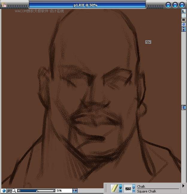 2.使用Chalk/Square Chalk进行素描的起稿。首先画出几个最基本的形体比例,以及相应的位置关系。Square Chalk的笔刷对纸纹比较敏感,因此会产生生动的纸纹效果。配合Intuos 3的细腻压感,可以画出更富有变化的粉笔线条,让作品充满活力。
