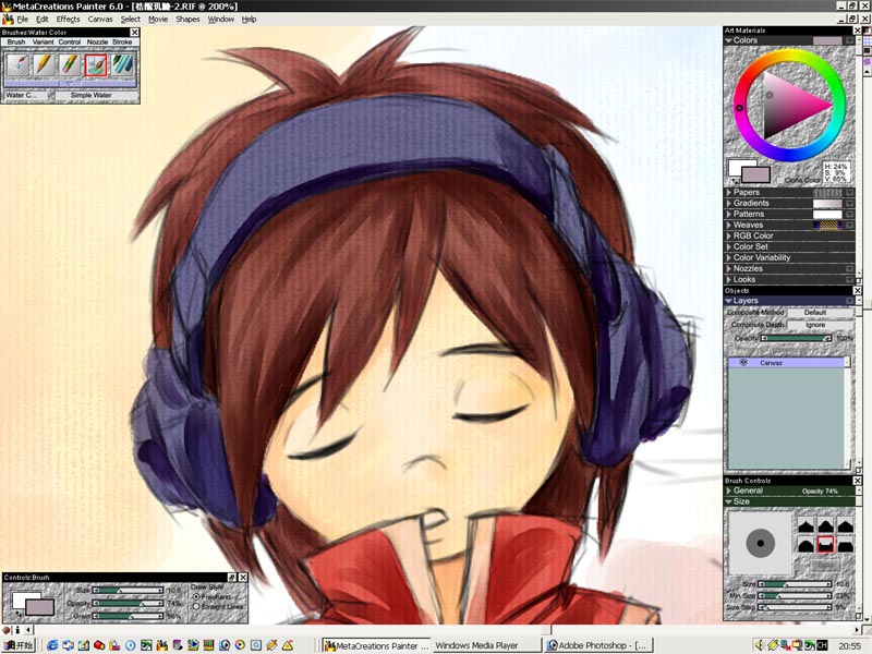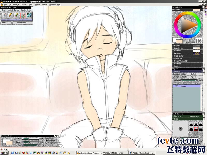 有的朋友问我要我的作画过程 于是就做了这么一个简易教程 希望对大家有所帮助:P 工具: Painter 6.0 非凡510 草稿就不多说了,任何人都会画的:P 主要是介绍上色的过程 前一部分是用水彩笔刷 后一部分是用油画棒 首先 这张 用simple water 把背景的大体颜色铺上 确定整个画面的色调