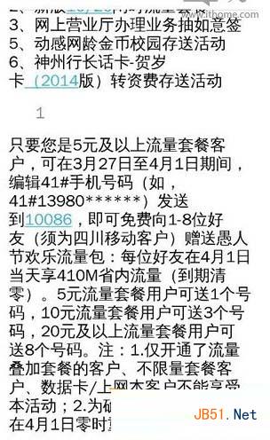只要你是5元以上流量套餐用户,即可编辑“41#好友手机号码”发送至10086,好友即可收到价值410M省内流量的“愚人节欢乐流量包”,快去和小伙伴们互赠流量吧!
