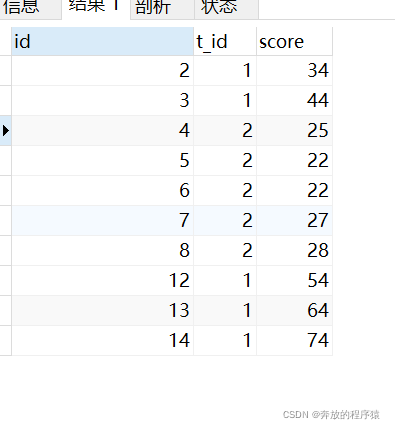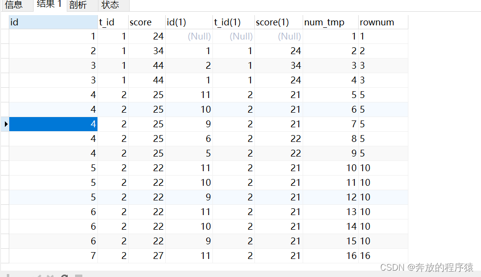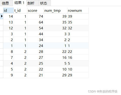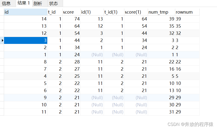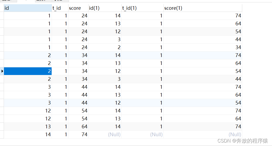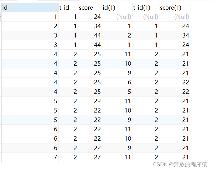 1.自身左外连接,得到所有的左边值小于右边值的集合。以t_id=1时举例,24有5个成绩大于他的(74、64、54、44、34),是第6名,34只有4个成绩大于他的,是第5名......74没有大于他的,是第一名。