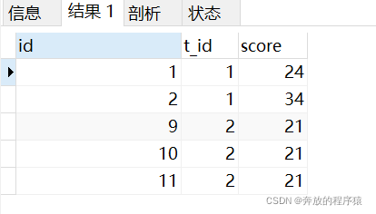 CREATE TABLE `t_student` ( `id` int NOT NULL AUTO_INCREMENT, `t_id` int DEFAULT NULL COMMENT '学科id', `score` int DEFAULT NULL COMMENT '分数', PRIMARY KEY (`id`) );