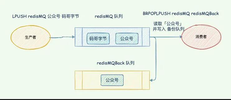 生产者用 LPUSH 把消息插入到 redisMQ 队列中,消费者使用 BRPOPLPUSH 读取消息「公众号」,同时该消息会被插入到 「redisMQBack」队列中。