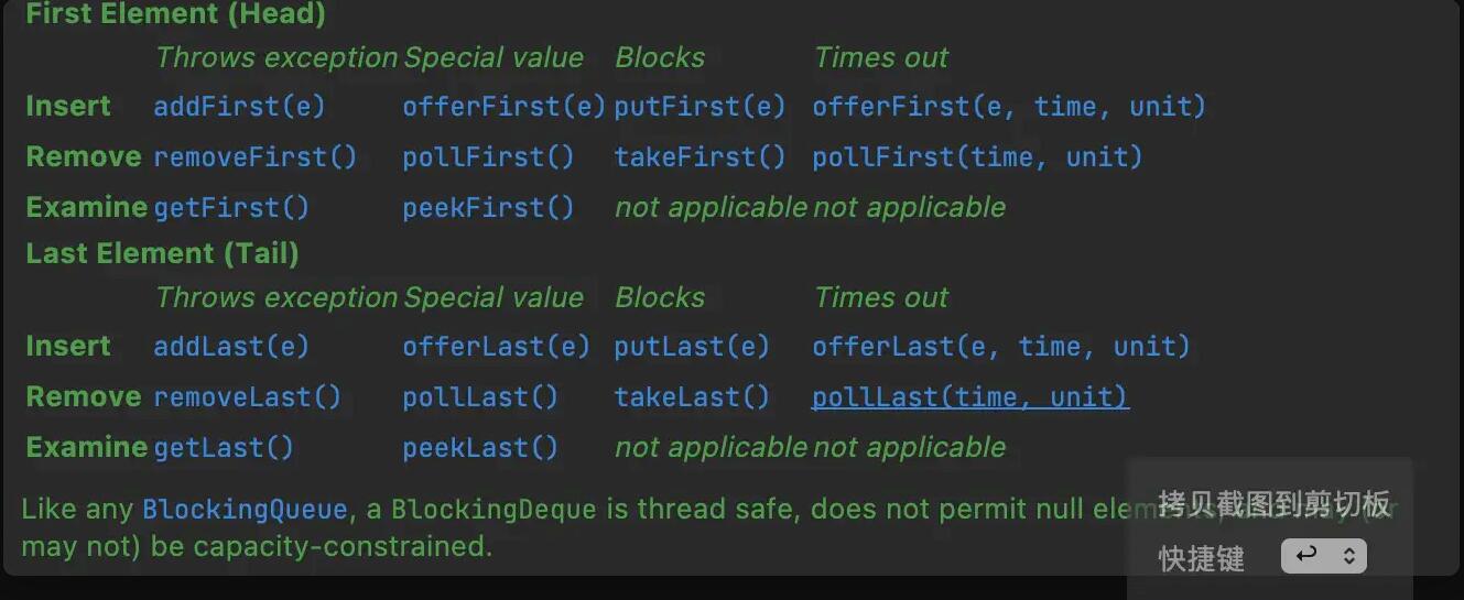 RBlockingDeque 继承 java.util.concurrent.BlockingDeque ,在使用过程中我们完全可以根据接口文档来选择合适的 API 去实现业务逻辑。