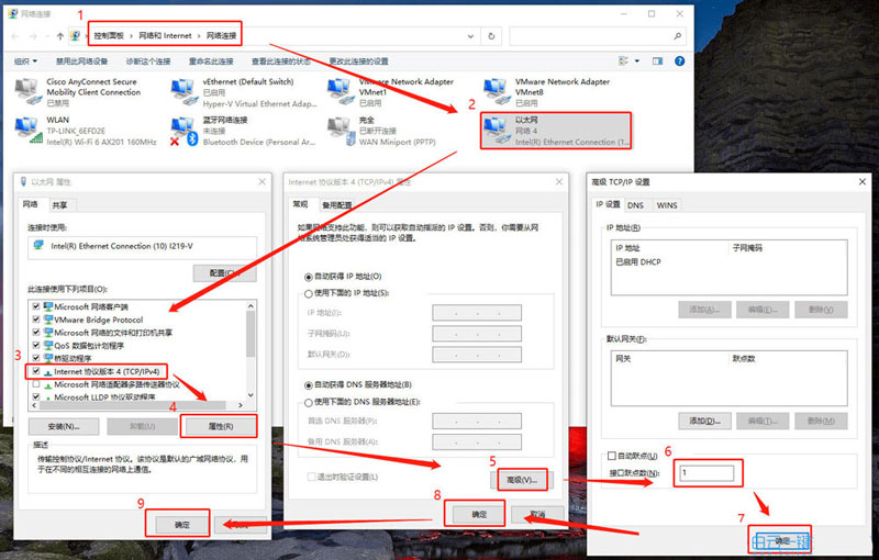 右键点击“以太网”,在打开的菜单项中,选择“属性”,点击选中“Internet协议版本4” - 点击“属性” - “高级” - 接口跃点数设置为“1”,各个窗口点击“确定”经常使用有线网访问外网,可以将有线网网络跃点数设置为“1”。如果经常使用无线网,那么就将无线网的跃点数设置为“1”。即哪个网络常用就设置哪个网络跃点数