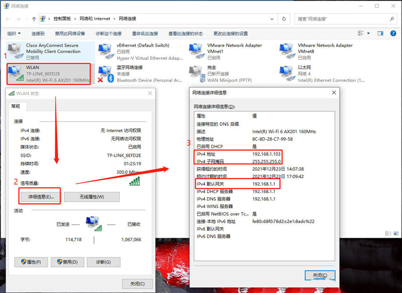 2、查看无线网信息当然路径为:控制面板 > 网络和 Internet > 网络连接,双击“WLAN” - 点击详细信息 - 查看“IPv4地址、IPv4子网掩码、IPv4默认网关”