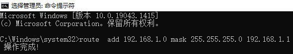 3、添加路由以管理员身份运行CMD命令提示符,输入:route add 192.168.1.0 mask 255.255.255.0 192.168.1.1