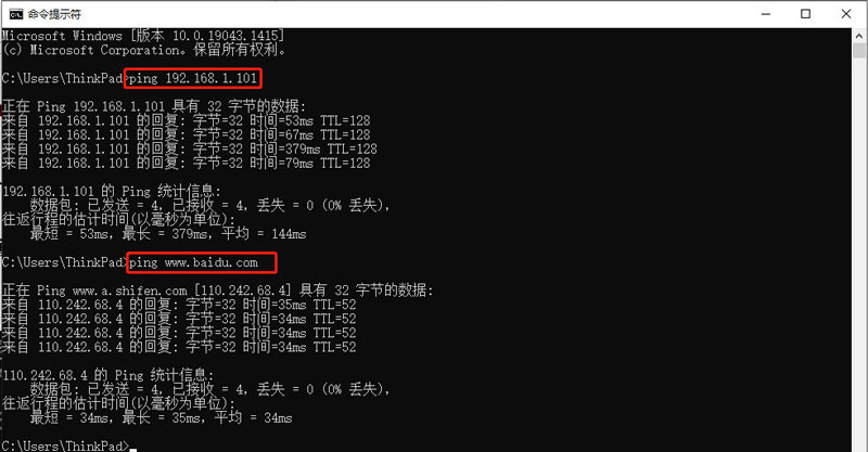 4、测试结果分别ping一下内网机器IP地址和百度地址设置成功!
