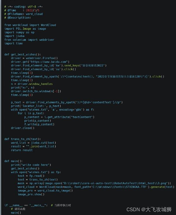 这里用到了selenium的webdriver, 使用的浏览器是firefox, 创建了一个firefox浏览器对象,然后firefox打开百度,定位到百度输入框,输入搜索词--新春祝福2022,浏览器页面显示如下