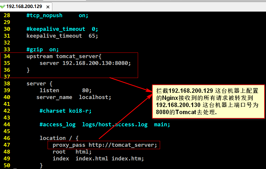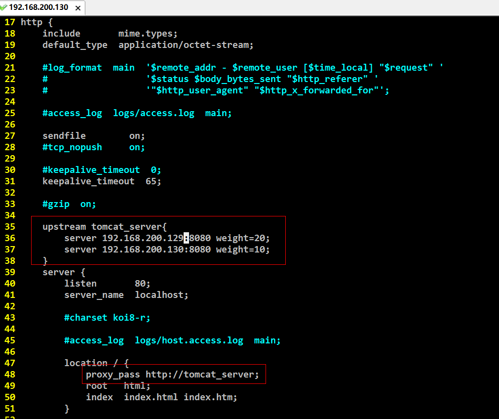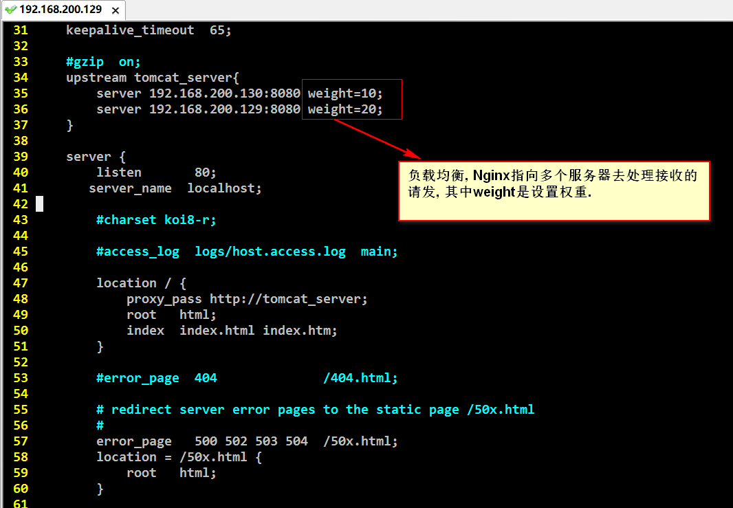 我们在这里配置了两台转发机器: 192.168.200.129和192.168.200.130, 它们的权重分别是2/3 和1/3, 也就是说访问三次192.168.200.129, 有两次是192.168.200.129上的Tomcat来处理, 有一次是192.168.200.130上的Tomcat来处理. 如果我们的Tomcat服务器更多 那么就需要在这里配置更多, 权重根据实际需求来划分.