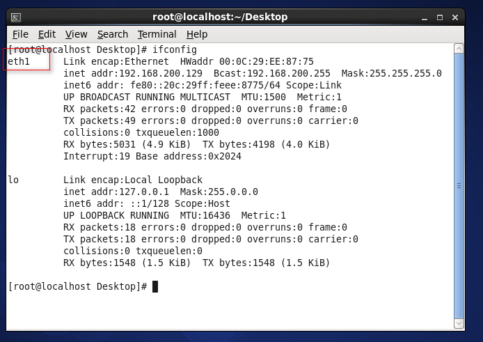 因为我的CentOS是拷贝过来的, 所以这里是eth1, 关于怎么查看, 我们在文章开头有查看本机ip: ifconfig, 那里面有显示我们的网卡就是eth1.