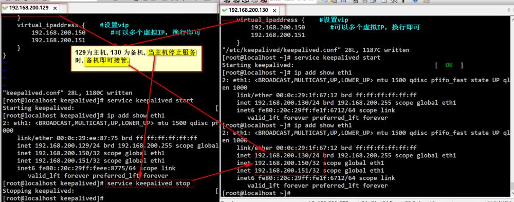 如果主机被修复好能够继续对外提供服务时, 这时keepalived会将主机上继续生成这个vip, 同时回收在备机上生成的vip. 这个是通过心跳检查来判断主机已恢复使用.