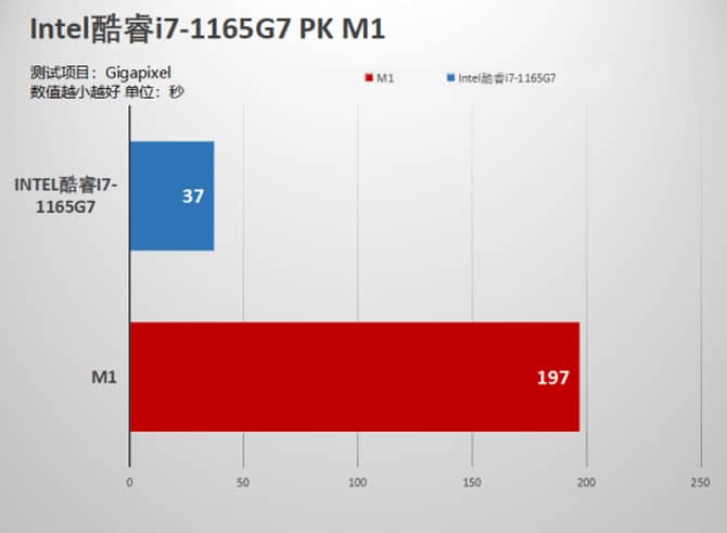 性能测试方面,平时我们很多时候需要将图片的分辨率提升,进而去制作海报宣传图等,这个是时候我们需要进行图片放大处理,我们选择了Topzlab中用来提高分辨率的工具Gigapixel进行测试,将一张图片分辨率放大6倍然后渲染输出,并且记录所用的时间长短,在这个测试中我们可以看到,Intel酷睿第11代i7-1165G7仅需要37秒就将一张2000*1333的图片放大到了12000*7998,而苹果M1芯片则用了197秒,性能相差近5.3倍,可以说明,Win11+Intel酷睿11代的双“11”组合在办公效率方面有着明显的优势。