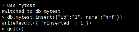 > db.mytest.insert({"id":"1","name":"hmf"}) //创建表插入数据(mongo是插入数据就直接创建表)
