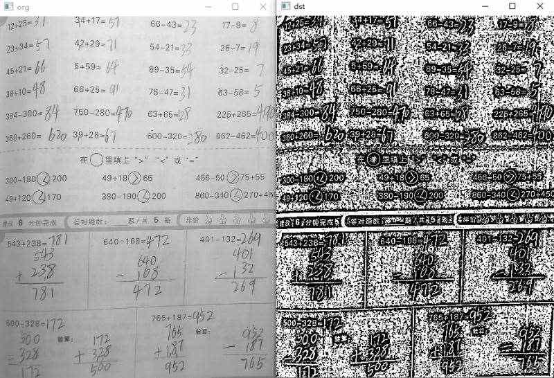 dst = cv2.adaptiveThreshold(img, 255, cv2.ADAPTIVE_THRESH_GAUSSIAN_C, cv2.THRESH_BINARY_INV, 11, 0)