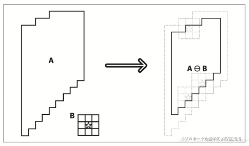膨胀和腐蚀相反,其原理是卷积核中间不为0,则整个卷积核区域的值都为1,如下图: