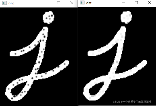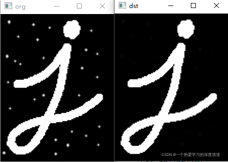 中间还是有一些噪点没有完全消除,可以调整卷积核大小,将卷积核调大,可以得到更好的效果;