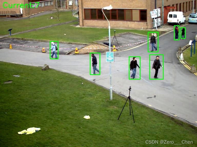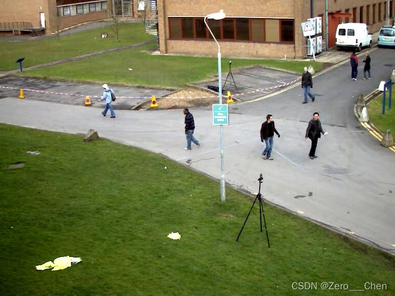 原图如图所示。本案例的需求是想要统计画面中的人流量。画面中走动的行人可以看作是前景,那么我们就需要将前景、背景分割出来。我们可以使用OpenCV提供的BackgroundSubtractorMOG2 高斯混合模型,将行人从画面中分割出来,然后提取轮廓就可以统计人流量了。