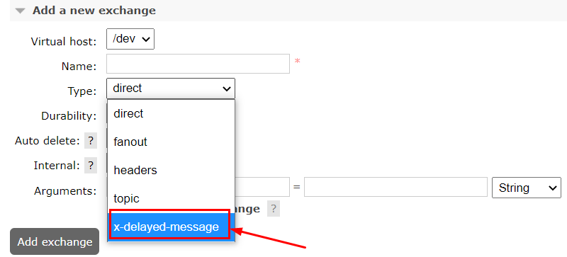 当你成功安装好插件后运行起rabbitmq管理后台,在新建exchange里就可以看到type类型中多出了这个选项