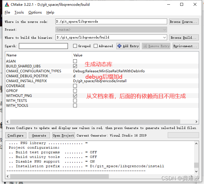 使用 CMake-gui 打开工程目录后点 Configure,勾上 BUILD_SHARED_LIBS 生成动态库而不是静态库,因为是 LGPL 协议。点 Add Entry 添加 CMAKE_DEBUG_POSTFIX 字段,类型为 String,值为 d,使 debug 模式生成结果带 d 后缀,去掉 WITH 那几个工具和测试相关的,用不着,而且有依赖。我这里还出现了 ICONV 依赖未找到的警告,直接忽略。配置好后点 Generate 生成 VS 工程文件。