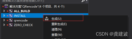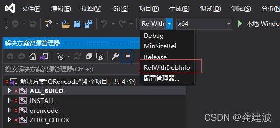 分别生成 Debug 和 Release 版本的 dll,如果需要带调试信息 Release,可以选 RelWidthDebInfo 。编译完后,install 到指定的目录中去,include 和 lib 两个文件夹就是最终我们需要的头文件和库文件;或者直接从编译生成的目录找对应文件。