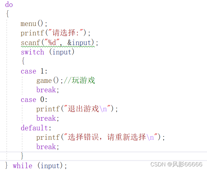 2.因为该程序想至少运行一次,所有选择用do while循环,而选择玩与不玩游戏时,则采用switch case语句比较合适,然后调用相应的函数即可