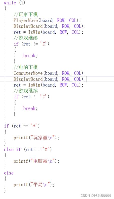每下一步棋都应该打印棋盘,同时还有判断游戏是否还需要继续,不继续,则跳出,判断输赢