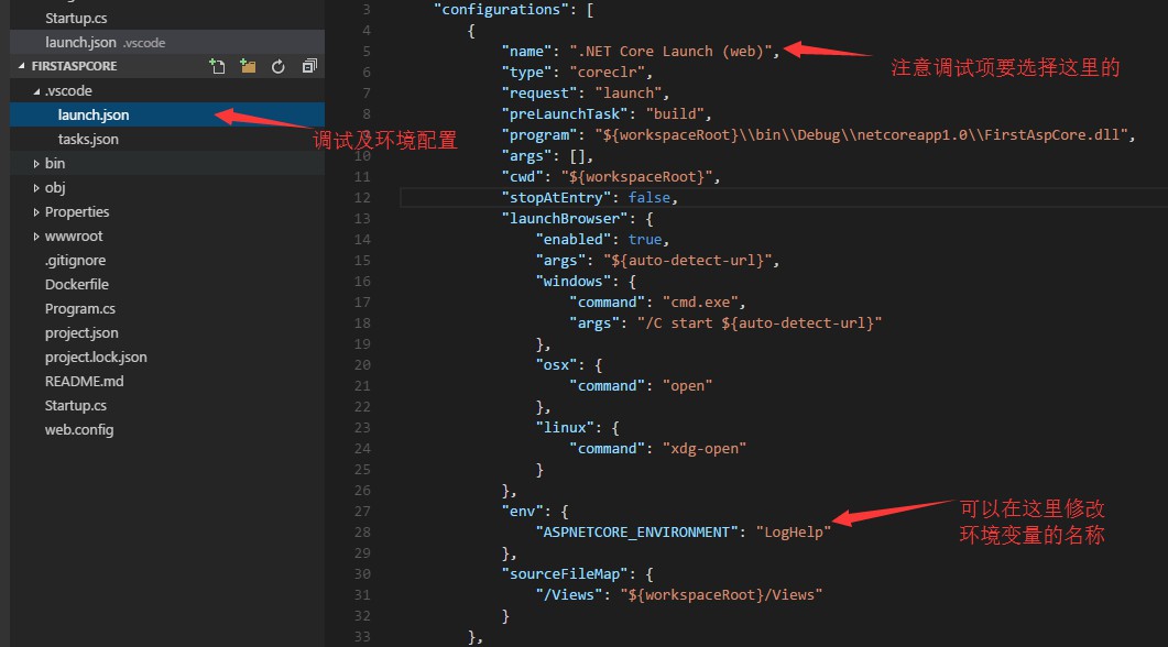 我们可以在文档中了解到,Core使用“ASPNETCORE_ENVIRONMENT”字段来描述当前运行环境名称这就是上文中提到的环境配置,官方预设了3个环境名分别是Development(开发环境), Staging(测试环境), Production(生产环境),如果您使用的是VSCode您可以在.vscode文件夹下的launch.json中找到“ASPNETCORE_ENVIRONMENT”字段,可以发现默认情况下是Development,那说这些到底有什么用呢?
