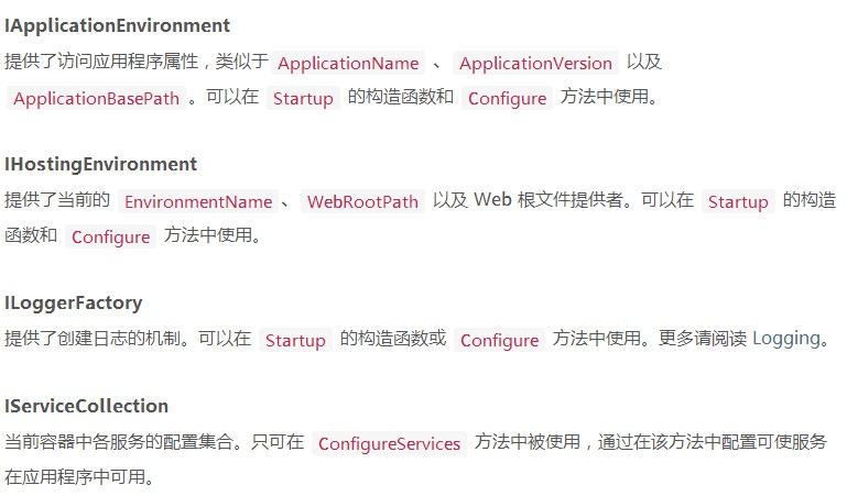 Configure这个方法是用于配置中间件到中管道容器(IApplicationBuilder),所以这个方法必须要包含一个IApplicationBuilder参数用来接受管道容器,方便开发者配置。当然他还可以接受其他的可选参数供开发者使用如下:
