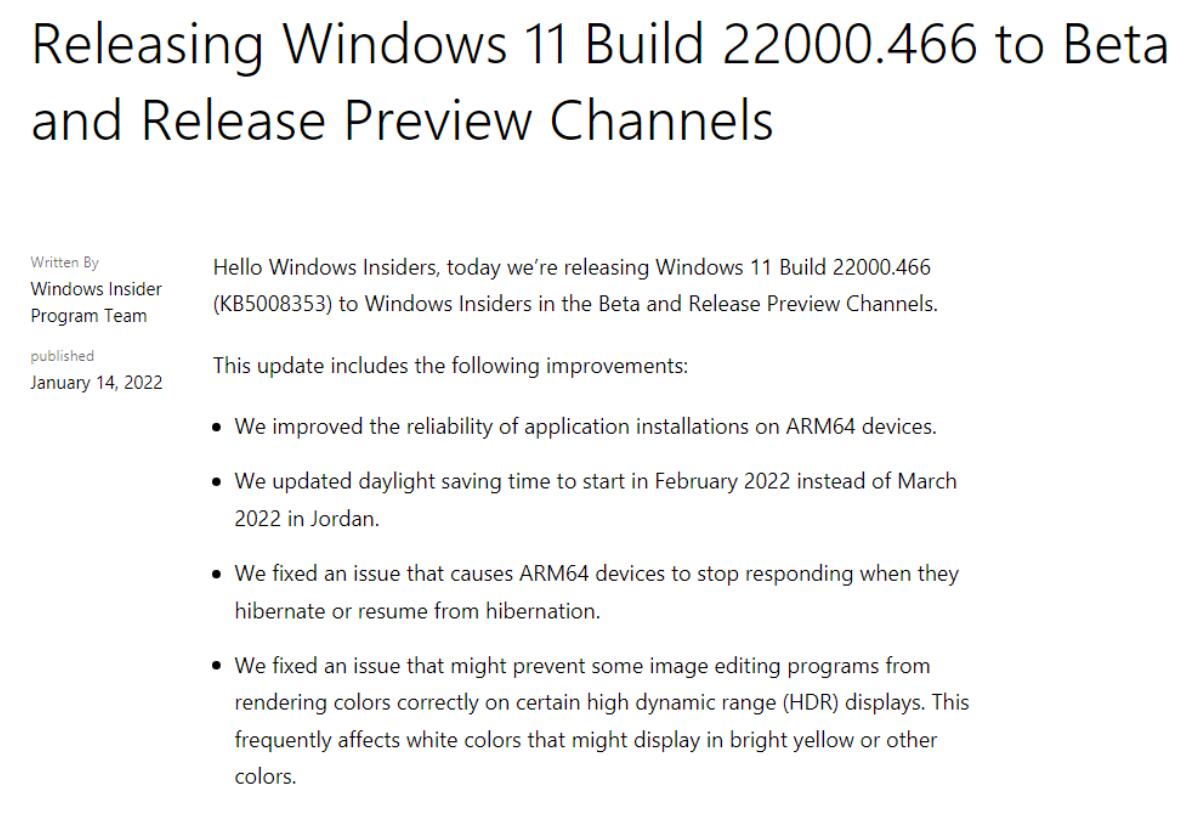 今日微软正式推送了 Win11 Build 22000.466 预览版,向 Beta 和 Release Preview 通道推出,更新包名为 KB5008353。本次更新对系统进行了大量修复,改善了 ARM64 平台的兼容性和性能,改善了 HDR 模式下图片后期软件显示错误的问题。