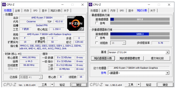 在CPU-Z的测试中,单核得分达到了601.8,多核得分5888.3。