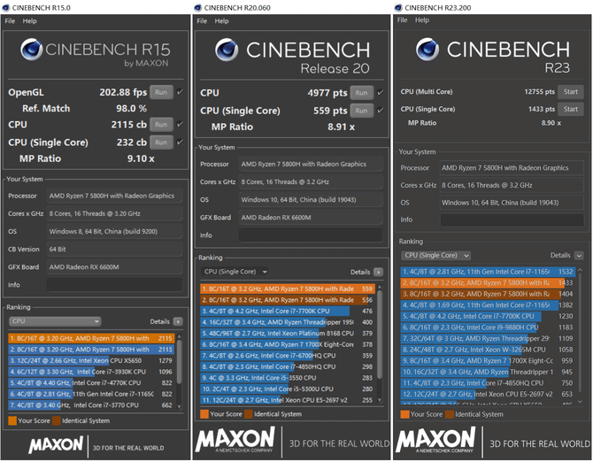 CINEBENCH是一款衡量CPU性能的测试软件,R15的测试中,单核成绩为232cb,多核成绩为2115cb;R20测试单核成绩为559pts,多核成绩为4977pts;R23测试单核成绩为1433pts,多核成绩为12755pts。