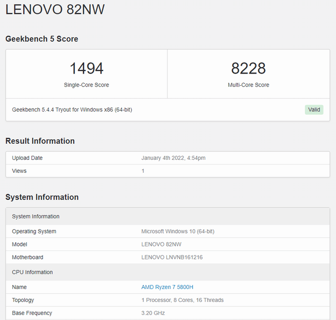 Geekbench 5能够相当完整地显示整个测试平台的硬件信息,并通过模拟不同的测试或工作场景来测量CPU性能。在最新版Geekbench 5.4.4的测试中,这款锐龙7 5800H处理器的单核成绩达到了1494,多核成绩8228,表现相当不错。