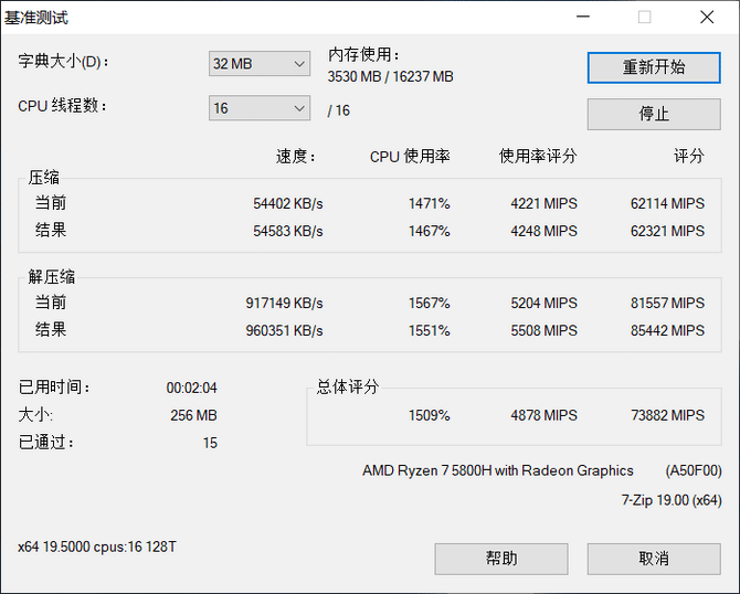 7-Zip是一款知名的压缩、解压缩工具,其内置的基准测试同样能够用于评估CPU性能,并以MIPS(每秒百万条指令)为单位显示评级。结果可见,总体评分达到73882 MIPS。