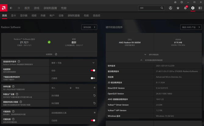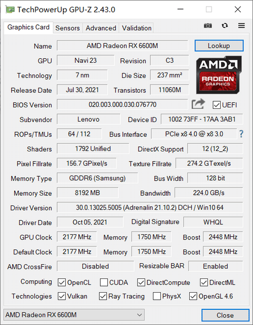 AMD Radeon RX 6600M采用了全新RDNA 2架构的Navi 23核心,1792个流处理器单元,核心频率默认最高可超频至2448MHz,显存采用的是三星8GB GDDR6,32M无限缓存(Infinity Cache)。RX 6600M还支持硬件光线追踪、AMD Smart Access Memory显存智取技术、AMD SmartShift动态功耗分配技术以及AMD FidelityFX等技术特性。此外,RX 6600M的功耗释放可达100W。