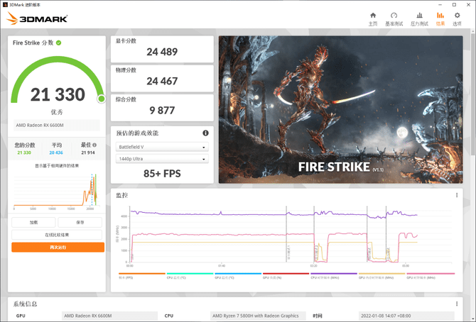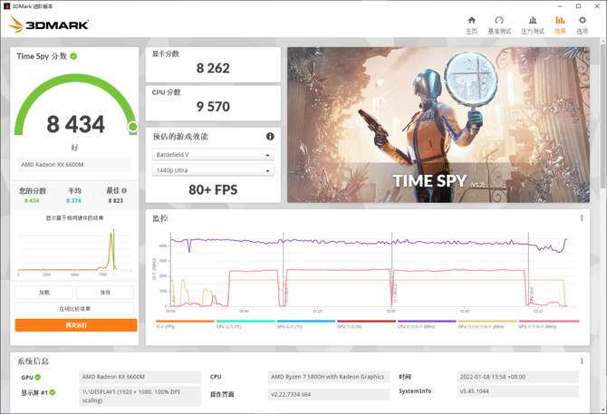 在3DMark Time Spy的测试中,Radeon RX 6600M取得了8434分的成绩,预估运行战地V游戏的帧率可达80+FPS。