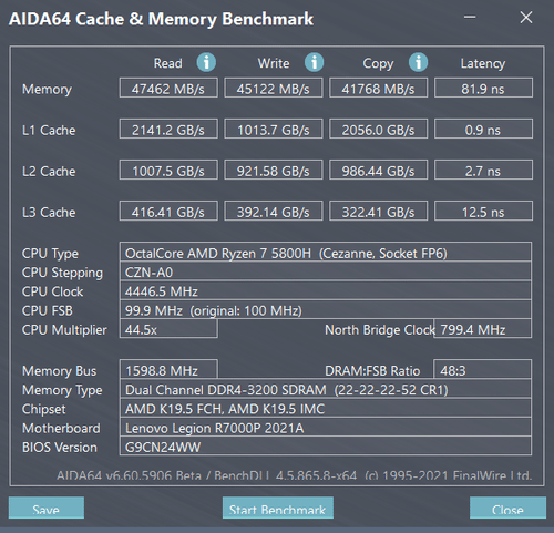 这款联想拯救者R7000P 2021还搭载了2×8GB 双通道内存,DDR4 3200MHz规格,运行AIDA64的内存缓存测试,读取速度为47462MB/s,写入速度45122MB/s,复制41768MB/s,延迟为81.9ns。